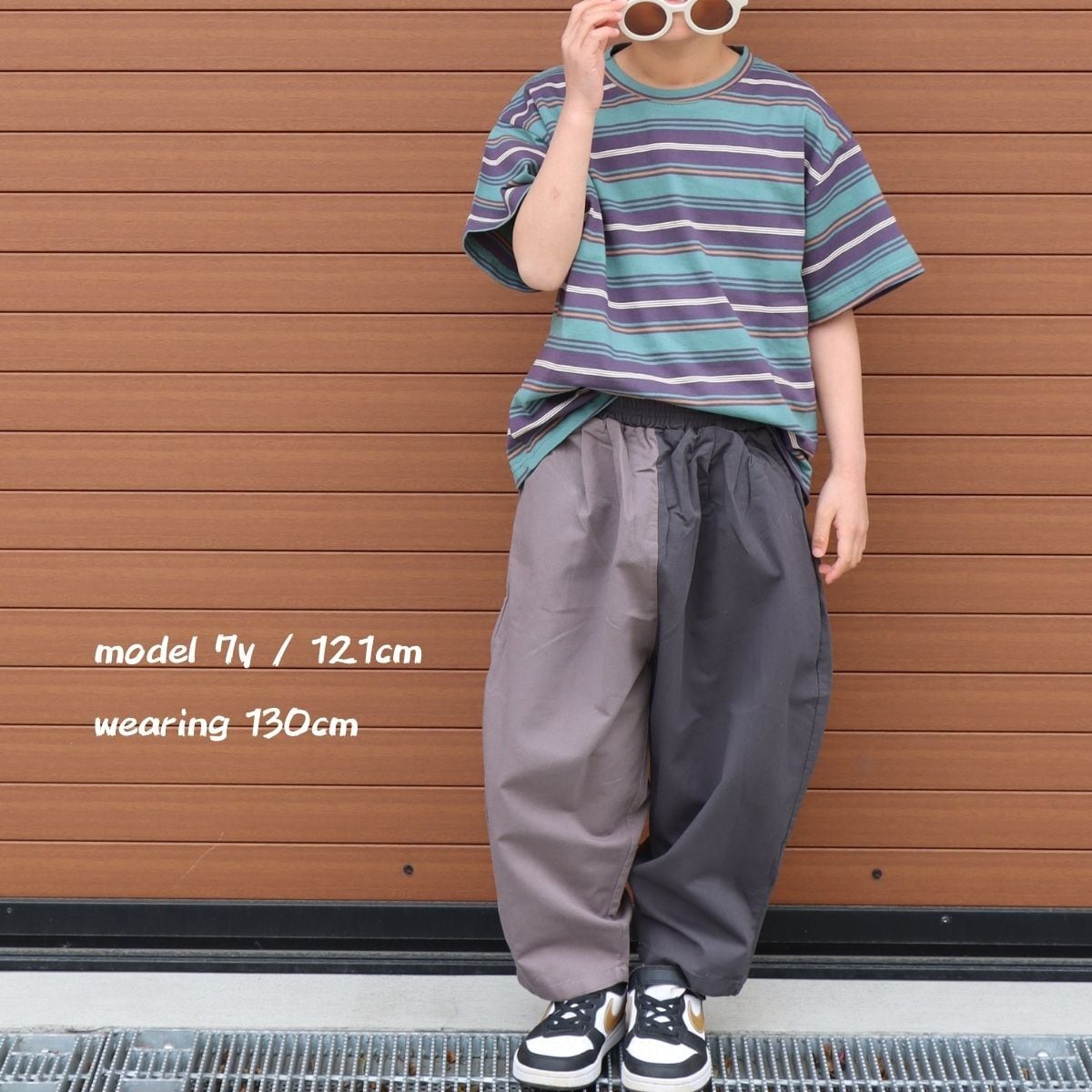 バイカラーが目を引くコットンワイドパンツ。